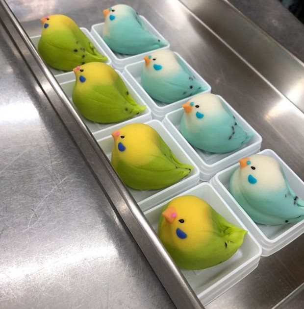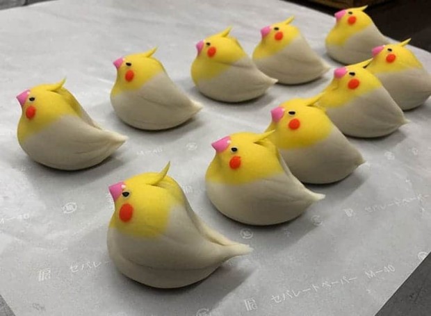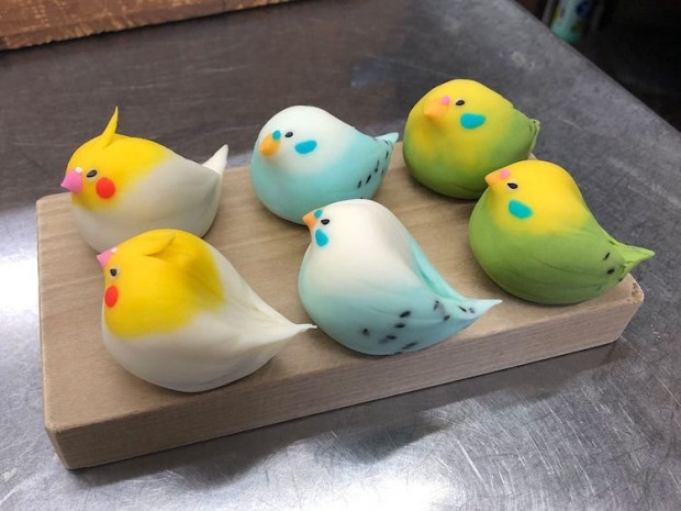 Kurokazu is a sweet shop owner (Wagashidokoro Kisshōan in Shōnan) who creates quite pretty, fancy wagashi. The most recent sweet forms that he uses are plump little birds in various colors. Kurokazu makes adorable, yellow cockatiels filled with koshian (red bean paste) inside. Also, there are green and blue budgerigars that came out of his creativity.